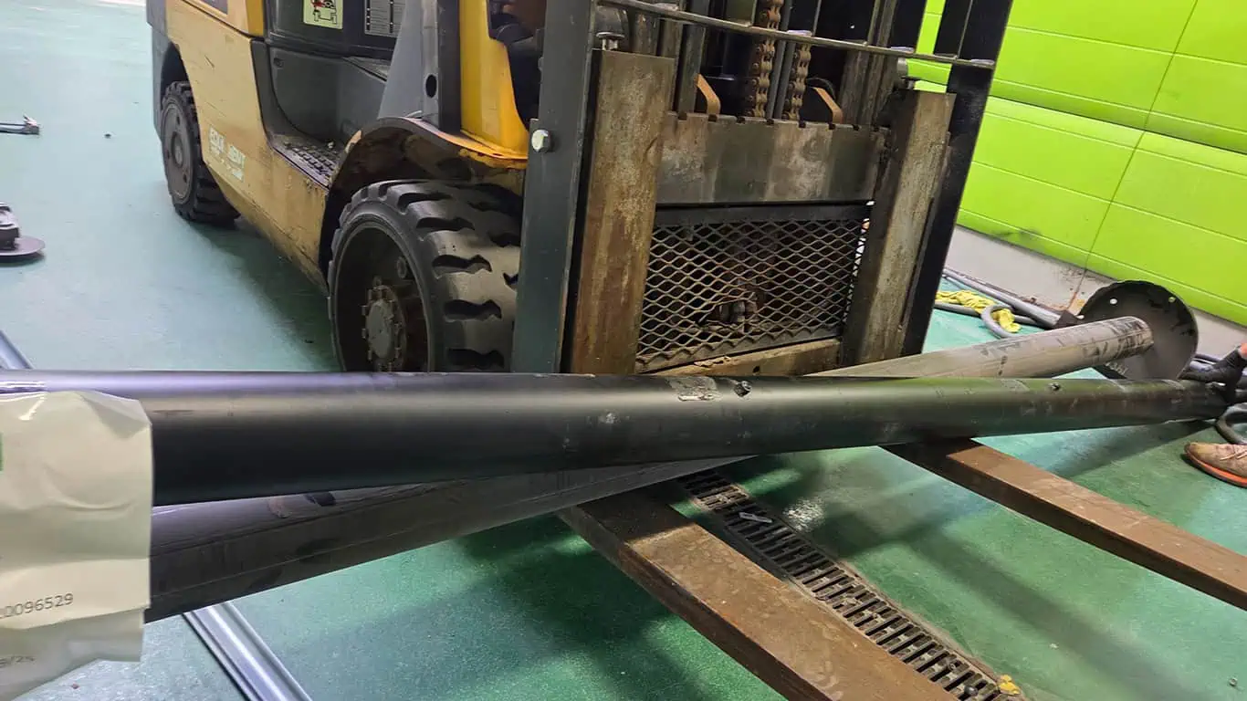 Lifted and supported the old barrel with the forklift, slid it clear, and lowered it safely.